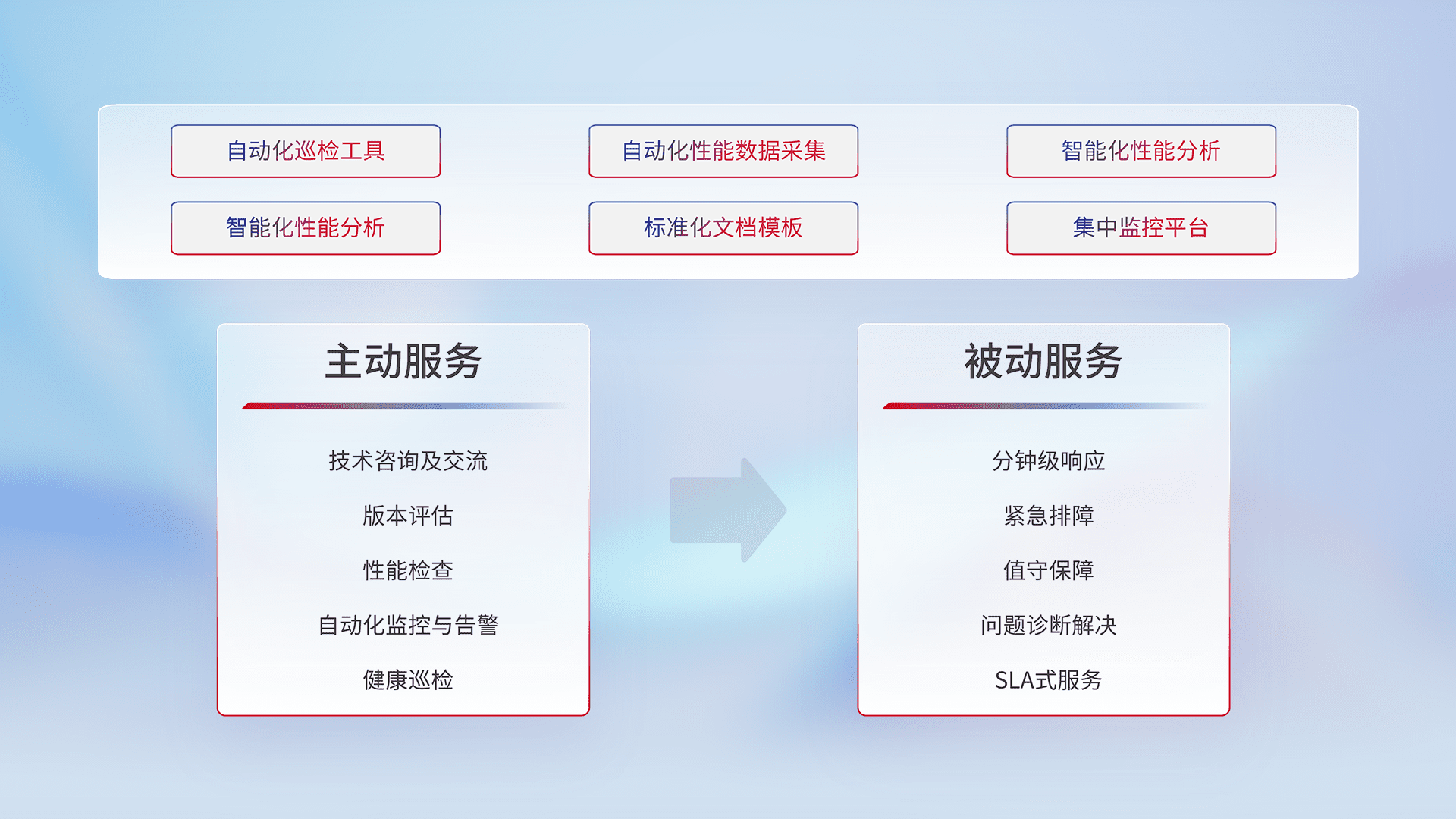 智能化工具和标准化文档,,,,保障服务质量,,,提供主动服务(包含技术咨询、、、版本评估、、、性能检查、、、、自动化监控与告警、、、健康巡检)和被动服务包含(分钟级响应、、、紧急排障、、值守保障、、、问题诊断解决、、、、SLA服务)。。
